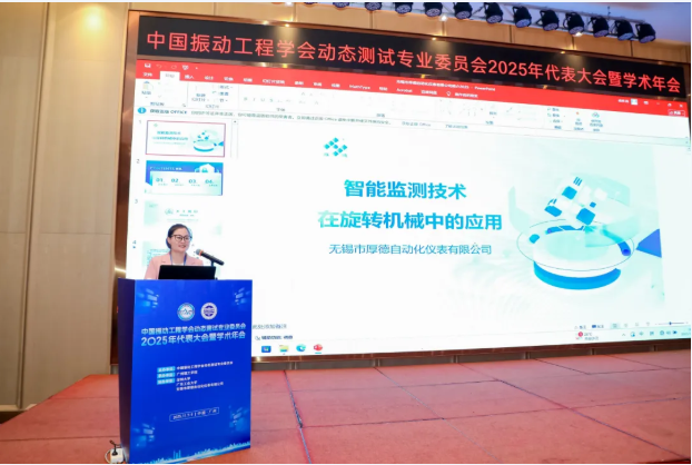 會議期間,我公司副總經理葉華美作專題報告,重點介紹了《智能監測技術在旋轉機械中的應用》。她結合厚德儀表的實戰案例,闡述了如何通過智能傳感與數據分析技術,為旋轉機械實現預測性維護與安全增效,獲得了在場專家的廣泛關注與交流。
