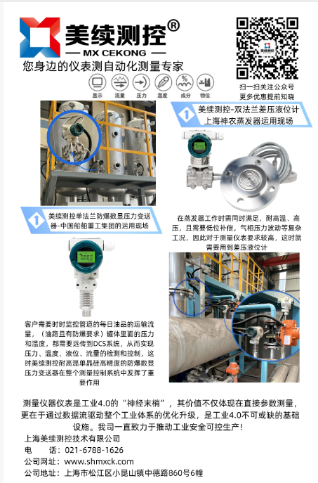 上海美續測控憑借在工業測控技術領域近十年的深耕,攜自主研發的壓力變送器、溫度傳感器、流量計、差壓變送器等全系列高精度儀器儀表重磅登場。這些專為蒸發結晶工藝復雜工況設計的核心產品,具備耐高溫、抗腐蝕、長期穩定性強的特點,能夠實時監測蒸發器內壓力波動、溫度梯度、流體流量及差壓變化,為工藝優化提供精準數據支撐,顯著提升生產效率與資源利用率