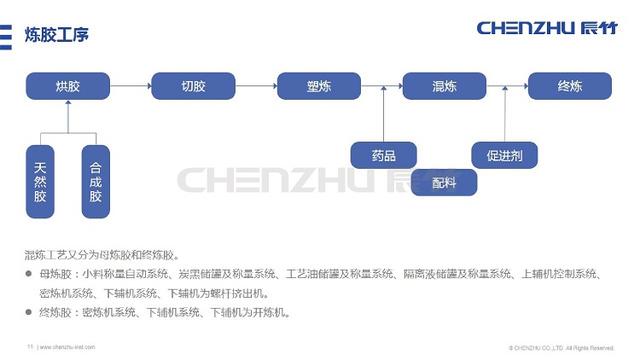 煉膠工序是把炭黑、天然/合成橡膠、油、添加劑、促進劑等原材料混合到一起,通過密煉機等設備的加工,生產出“膠料”的過程。膠料的配方取決于輪胎的性能要求。所有的原料在經過測試并被放行后,方可進入下一道工序。