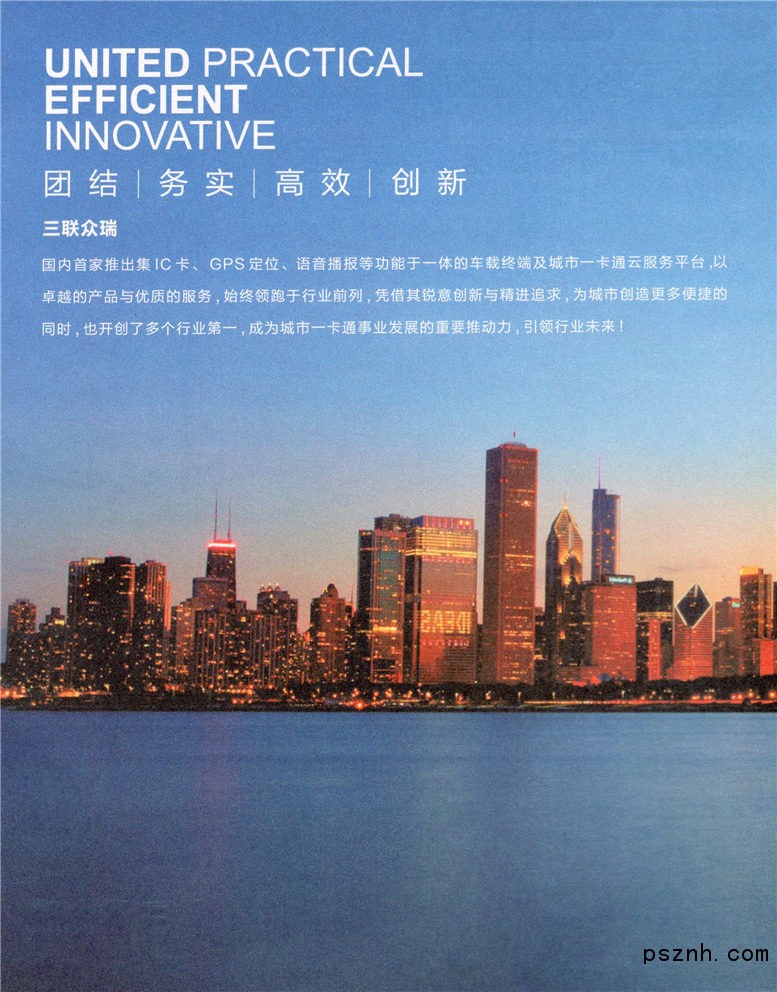 多年來,三聯眾瑞以“團結、務實、高效、創新” 為企業發展的座佑銘,本著“質量第一,服務第一,信譽第一”的服務 宗旨,為用戶提供滿意的產品,提供最滿意的服務。今后,三聯眾瑞仍然會圍繞公共交通科技發展這一主題繼續探索、研究,努力為公共交通行業的進一步發展做出更大的貢獻。同時,公司竭誠邀請各界朋友攜手合作,共同開拓美好的明天。