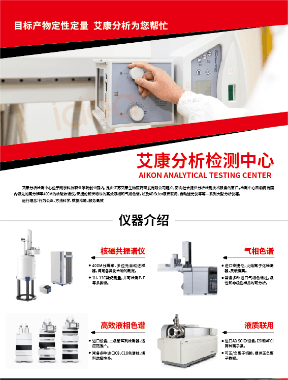南京艾康分析檢測(cè)中心位于南京市江北新區(qū)化工園內(nèi),是由江蘇艾康生物醫(yī)藥研發(fā)有限公司建立,面向社會(huì)提供分析檢測(cè)技術(shù)服務(wù)的窗口。成立以來檢測(cè)中心不斷的發(fā)展和完善,以符合行業(yè)標(biāo)準(zhǔn)的分析檢測(cè)實(shí)驗(yàn)室,和“行為公正、方法科學(xué)、數(shù)據(jù)準(zhǔn)確、服務(wù)高效”的運(yùn)行理念,為社會(huì)各界提供專業(yè)高效的技術(shù)服務(wù)。